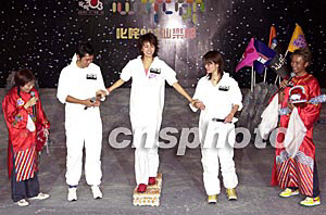 眾歌星7月22日在香港九龍灣展貿中心出席商業(yè)電臺《03之夏903給你一個星級會所·仙樂都》記者會,歌星李克勤一身古裝新郎裝飾,打扮搶鏡介紹活動詳情。作者:鄧慶樂