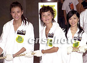 歌星黃伊汶、陳文媛、關心妍7月22日在香港出席商業(yè)電臺活動《03之夏903給你一個星級會所·仙樂都》記者會,她們組成的歌星隊與商臺DJ進行拔河較量,勝出后展現(xiàn)笑容。作者:鄧慶樂
