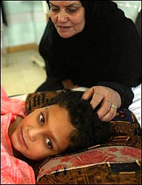 醫院的人員給了納克霍爾一個口罩和罩衣,然后領她進了一個病房,與這家醫院其它病房的混亂場面相比,這間病房相當安靜,里面一個婦女坐在一個低矮的床上,而床上一個小男孩兒躺一個骯臟的毯子上,身上罩了一個生了銹的金屬籠子,頭上包著厚厚的白繃帶,他用大大的眼睛靜靜地看著那個婦女,令人心驚肉跳的是他的兩只胳膊從肩膀處就沒有了,下巴以下的身體軀干上有一塊大大的傷疤,被燒成了黑木炭樣。