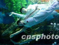中國北方海濱名城大連新建的海洋公園,在渡過今春抗擊SARS的旅游淡季后,如今每天表演的水下夢幻婚禮,滿池鯊魚好似一對新人的伴郎和伴娘,吸引各地觀眾場場客滿。中新社記者:賈國榮