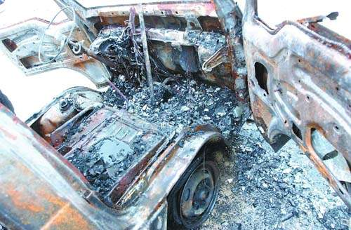 肇事的車子是0.6噸貨車,車上的擋風玻璃已經(jīng)完全破碎,前兩輪胎處只剩下架子,方向盤只剩下圓形金屬,以及一把土制手槍、一把尖刀。值得一提的是,在車輛的殘骸上還有大量的塑料桶,有的是藍色,有的是白色,據(jù)一保安介紹,這些塑料桶是用來裝易燃液體的。昨天上午9時47分,一輛車身標志是“刑事勘察車”的車輛駛?cè)氪逦瘯笤海瑥能嚿献呦聛頂?shù)位警員,現(xiàn)場一共10多名警察不時交談著什么。最后警察將所有證物搬上車子后方離開。