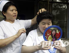 8月16日清晨,中國最后康復出院的SARS患者盧志艷在北京地壇醫院ICU病房護士長劉小冬幫助下精心梳妝準備參加出院慶典儀式。盧志艷是北京小莊醫院藥劑師,4月25日感染SARS住院治療時間長達112天。中新社記者:任晨鳴