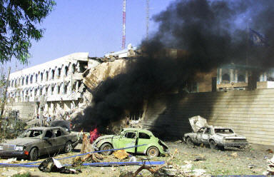 一名美國軍方女發言人告訴路透社說:“我們可以肯定大約在當地時間下午4:30分(北京時間19日晚上9點),一個汽車爆炸對聯合國駐巴格達總部大樓發動了襲擊!(章田)