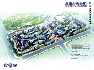 這個設計方案把傳統的中國住宅規劃模式轉化為由奧運五環幻化而成的曲線,圓形升旗廣場象征“龍珠”。