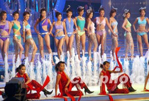 據(jù)美國《世界日?qǐng)?bào)》報(bào)道,始于1973年的港姐選舉,今年是第31屆。本屆決賽主題是“秋水伊人――脫俗出塵”,主辦單位香港電視廣播有限公司(無線)特意斥巨資在場(chǎng)內(nèi)搭建大型游泳池突顯主題。佳麗們時(shí)而在泳池中“芙蓉出水”,時(shí)而在封蓋的泳池上歌舞。背景臺(tái)上描繪的是典雅的中國山水畫,映襯出佳麗們脫俗的氣質(zhì)。