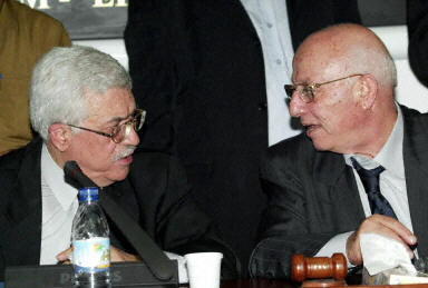 圖為2003年9月4日拍攝的資料照片,巴勒斯坦立法委員會主席庫賴(右)與已經提出辭職的巴勒斯坦自治政府總理阿巴斯在西岸城市拉姆安拉舉行的一次立法委員會會議上交談。