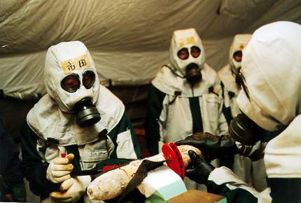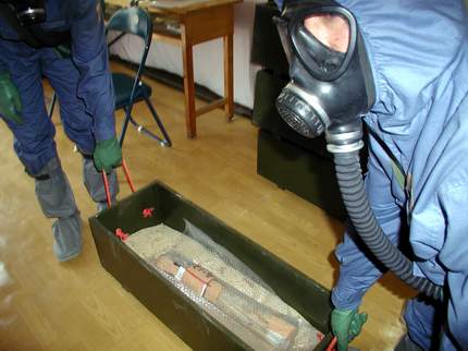 具體的處理程序是:金屬探測————先通過電磁探測,測出毒彈掩埋的準確邊際,確定挖掘的方位;挖掘作業————使用銅針、銅鏟等器具,小心將已經銹蝕、滲漏的毒氣彈挖掘出來;冷卻處理————將挖掘出的毒氣彈放置到零下40℃的冷藏柜,進行12個小時的冷卻,使毒氣彈溫度降到零下30℃;X光鑒別————通過大功率X光鑒別,搞清楚毒彈內部結構;彈、藥分離———將彈體切割;外形鑒別;密封包裝。