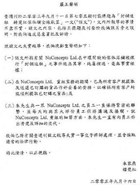 (一)該文所指有關(guān)NuConcepts Ltd.在中環(huán)開設(shè)的家俬店鋪被銀行“封鋪?zhàn)纷狻敝录^無其事,純屬捏造,毫無事實(shí)根據(jù);(二)在NuConcepts Ltd.重組業(yè)務(wù)的期間,已為所有客戶就提取及送遞已訂購的貨品作好妥善的安排,以確保所有客戶均能順利提取已訂購之貨品;(三)朱先生與一眾NuConcepts Ltd.之員工一直保持緊密的聯(lián)系,并每天均與其大部分員工保持溝通及接觸。就NuConcepts Ltd.重組的細(xì)節(jié)方面,朱先生一直有向員工作出清楚及詳細(xì)的交代。