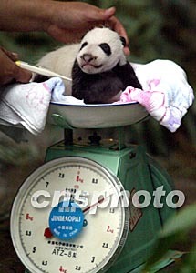北京動物園大熊貓“妞妞”8月24日產下的幼崽在9月24日滿月之日第一次睜開了雙眼,小家伙已經初具大熊貓的外貌,體重從出生時的150克猛增到1160克。中新社記者:任晨鳴