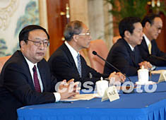 全國(guó)政協(xié)副主席霍英東任團(tuán)長(zhǎng)的香港工商界知名人士訪問(wèn)團(tuán),九月二十七日在北京與國(guó)家發(fā)展改革委員會(huì)和商務(wù)部舉行座談會(huì),國(guó)家發(fā)展改革委員會(huì)副主任朱之鑫(左一)、商務(wù)部長(zhǎng)安民(右一)、國(guó)務(wù)院港澳辦副主任陳佐洱等出席。中新社記者:滿會(huì)喬
