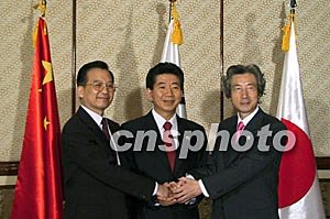 溫家寶、日本首相小泉純一郎以及韓國(guó)總統(tǒng)盧武鉉今天在巴厘島舉行了中日韓領(lǐng)導(dǎo)人第五次會(huì)晤。三國(guó)領(lǐng)導(dǎo)人就中日韓三國(guó)合作、三國(guó)與東盟合作以及其他共同關(guān)心的問(wèn)題進(jìn)行了討論。