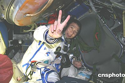 六時四十五分,身著白色宇航服的航天員從返回艙中神采奕奕探頭出來,他把面罩向上一拉,微笑著向迎接他回家的人們揮手致意。一時間、草原上掌聲雷動,許多人激動地流下了熱淚。