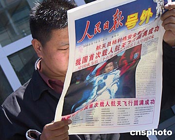 圖:北京市民關(guān)注“神舟”五號(hào)成功發(fā)射