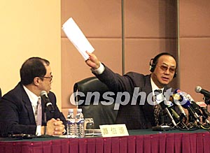 “內(nèi)地與澳門關(guān)于建立更緊密經(jīng)貿(mào)關(guān)系的安排”今天下午在澳門特區(qū)政府總部簽署。簽署儀式后,兩位簽署人安民和澳門經(jīng)濟(jì)財政司司長譚伯源在澳門世貿(mào)中心舉行新聞發(fā)布會,向媒體介紹有關(guān)情況。