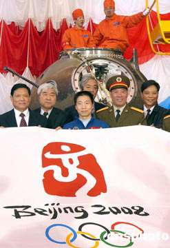 十月十八日,中國神舟五號載人飛船回收艙搭載物品開艙儀式在中國航天科技集團公司北京空間技術研制試驗中心舉行。中國首位航天員楊利偉(中)、2008年北京奧運會奧組委主席劉淇(左一)等共同展示太空“乘客”——2008年北京奧運會會徽旗幟。中新社記者:張煒