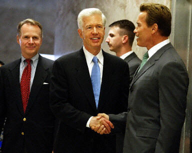 新當選的加州州長阿諾-施瓦辛格于周四會晤了競選中的老對手、現任州長戴維斯。雙方共同宣稱已經開始“友好關系”,并表示在阿諾正式接任州長職務之前,兩人將并肩努力。