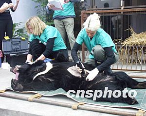 亞洲動物基金10月24日在成都中醫藥大學召開的“熊膽替代研討會”上宣稱,該基金正式啟動的“拯救黑熊、棄用熊膽”的熊膽替代宣傳教育系列行動揭開序幕,以讓更多的亞洲黑熊得到保護和救助,最終實現在中國淘汰活熊取膽業的目標。圖為“四川龍橋黑熊救護中心”的外籍獸醫為剛從養熊場解救出的亞洲黑熊體檢。作者:魯彥