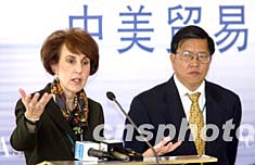 博鰲亞洲論壇2003年會(huì)十一月三日舉行中美貿(mào)易關(guān)系:挑戰(zhàn)與合作主題午餐會(huì),昔日中美貿(mào)易談判對(duì)手美國(guó)前貿(mào)易代表巴舍夫斯基與現(xiàn)任博鰲亞洲論壇秘書(shū)長(zhǎng)的龍永圖再度相遇,以論壇的形式共同探討中美貿(mào)易關(guān)系。中新社記者:毛建軍