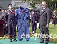 11月5日,香港特區政府在禮賓府舉行中國首次載人航天飛行代表團歡送儀式,中國首位升空宇航員楊利偉向特首董建華致送他受訓時所穿著的制服。中新社記者:鄧慶樂