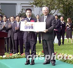 11月5日,香港特區政府為中國首次載人航天飛行代表團舉行歡送儀式,特首董建華向楊利偉致送訪港時的相片。中新社記者:鄧慶樂