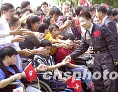 11月5日,香港特區政府在禮賓府舉行中國首次載人航天飛行代表團歡送儀式,在場的群眾爭相與代表團成員握手道別。中新社記者:鄧慶樂