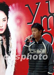 香港歌手鄭希怡15日在時(shí)代廣場舉行新碟發(fā)布會(huì),“師弟” 吳浩康到場獻(xiàn)唱助威。中新社記者:譚達(dá)明