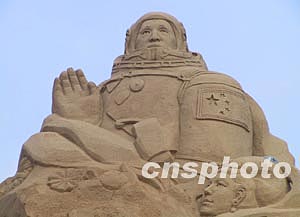 首屆海口國際沙雕賽十一月十五日在海口市西海岸大海邊開雕。來自中國、美國、西班牙等七個(gè)國家的數(shù)十名沙雕藝術(shù)家們參加本次比賽。圖為中國藝術(shù)家們雕刻的航天英雄楊利偉形象。中新社記者:王辛莉