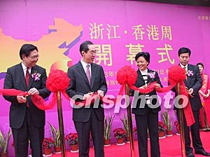 由浙江省人民政府和香港特區政府主辦的浙江香港周活動二十七日開幕。圖為浙江省委副書記喬傳秀、副省長鐘山、香港特區政府財政司司長唐英年出席開幕式。作者:張茵