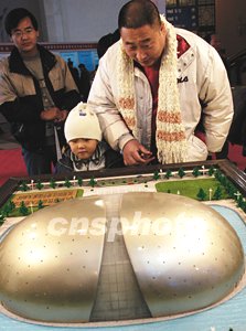 十二月十日在北京展覽館開幕的“第三屆中國國際鋼結構展覽會”上,中國武漢鋼鐵公司展臺前的“國家大劇院”建設項目,受到眾多觀眾的注意。目前北京建設中的國家大劇院,在冬季已完成鋼架結構組裝。中新社記者:鄒憲