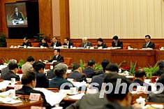 中共中央政治局委員王兆國,二十二日在十屆全國人大常委會第六次會議上作中共中央關于修改憲法部分內容建議的說明。中新社記者:滿會喬