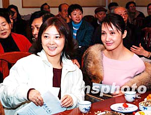 圣誕前夜,北京《夢(mèng)回紅樓》酒家召集電視連續(xù)劇《紅樓夢(mèng)》部分原班人馬茶敘,宣布電視劇《紅樓夢(mèng)》重拍正式起動(dòng)。圖為出席會(huì)議的原《紅樓夢(mèng)》中妙玉的扮演者姬陪杰(右)和賈惜春的扮演者胡澤紅(左)。中新社記者:王麗南