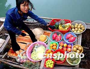 新年前越南下龍灣百姓在海面小船上向游客兜售水果。地處熱帶地區的越南冬季進入旅游高峰,每年元旦春節都有中國大批游客到越南旅游。中新社記者:宋吉河