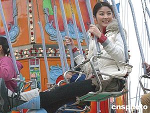 香港歌星陳慧琳元月十七日參加正在添馬艦廣場舉行的環球嘉年華活動,為“空中秋千”機動游戲擔任操作員并與小朋友一起蕩秋千。作者:錢興強