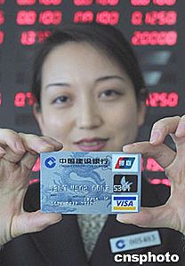 一月十八日,中國建設銀行的一名員工展示由建設銀行發行的“銀聯卡”。作者:徐曦弋