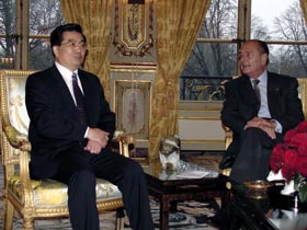 二十六日下午,希拉克和胡錦濤在法國總統(tǒng)府舉行小范圍會談