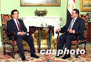 胡錦濤指出,中埃人民長期友好,兩國一貫相互支持、平等相待。特別是一九九九年江澤民主席和穆巴拉克總統確定建立兩國戰略合作關系以來,兩國政治關系越來越密切,經貿合作不斷擴大。胡錦濤說,中國重視埃及在地區和國際事務中的作用,一直把埃及視為中國在阿拉伯世界和非洲大陸重要的合作伙伴。為進一步發展中埃兩國關系,我們建議:一、兩國領導人保持經常互訪和其他多種方式的接觸,增進相互了解,擴大共識;二、提高經貿合作水平,擴大在電子、通信、醫藥、旱作農業等領域的合作,開拓石油、地鐵、航空、人力資源培訓和服務貿易等新的合作領域,通過發展解決當前兩國貿易中存在的不平衡問題;三、推動兩國在文化、教育、旅游和新聞等領域的合作;四、加強在國際事務中的合作和協調。我們深信中埃戰略合作關系的不斷鞏固和發展將給兩國人民帶來更多的實際利益。