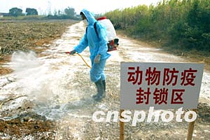 中國內地首發禽流感疫點--隆安縣丁當電灌站入口二月十二日工作人員在定時消毒。疫情發生后,這里嚴格按照規定進行定時消毒。中新社記者:宋吉河
