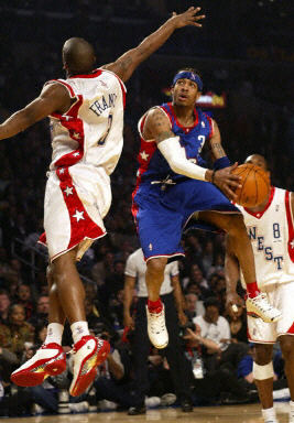 洛杉磯湖人隊的艾弗森在對戰西部全明星隊的弗朗西斯,兩名小個子球員上演空中舞蹈。