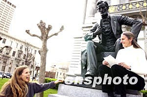 相戀十二年的諾艾爾(左)和黛安娜(右)是二月二十日從舊金山市政府領到結婚證書的第七十二對同性伴侶,她們和其他同性伴侶一樣在市政廳外的林肯像前合影。從二月十二日起,舊金山市政府決定給同性戀者發放結婚證書,舊金山一時成為同性戀者向往的地方。作者:陳鋼