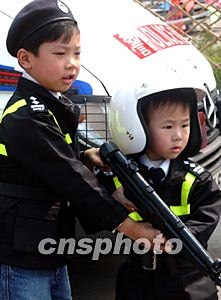香港西區(qū)警區(qū)聯(lián)同中西區(qū)滅罪行委員會,二月二十二日舉行滅罪跑嘉年華活動,該活動的目的是透過有益的活動宣傳滅罪訊息并推廣健康生活,圖為兩位小朋友對展示的警務(wù)器械頗感興趣。中新社記者:錢興強(qiáng)