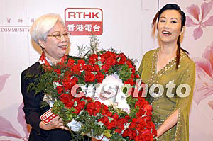 香港防癌會副主席潘若芙醫(yī)生代表大會向“阿姐”汪明荃送上花牌預(yù)祝她演唱會演出成功,及感謝她義務(wù)演出,該演唱會將于三月廿九日假香港文化中心大劇院舉行。