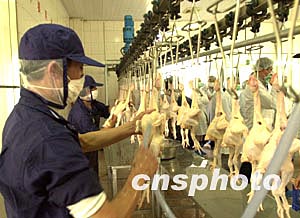 澳門特區民政總署和珠海出入境檢驗檢疫局一日在珠海舉行會議,就恢復因禽流感而中斷的活雞輸入問題進行協商并達成共識,雙方決定報國家有關部門批準后,從三月五日起同步恢復活雞、冰鮮雞、和凍雞的供應。圖為在為澳門進行活雞加工的珠海科泰有限公司畜禽食品廠的活雞加工生產在線,工人們對宰殺后的雞只進行認真的清洗。中新社傳真 李剛 攝