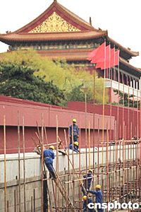 三月二十四日,北京天安門觀禮臺翻建工程開工,預計在今年十月一日國慶節前竣工。這是自中華人民共和國1949年成立以來天安門觀禮臺首次大規模翻建,翻建后的觀禮臺在形式、高度、色調等方面將與原觀禮臺風格保持一致。中新社記者:盛佳鵬