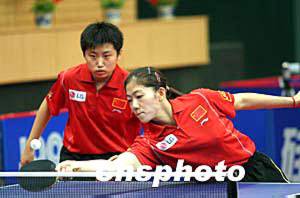 奧運乒乓球亞洲預選賽雙打比賽第二階段四月十二日晚在北京海淀體育館開賽,牛劍鋒(前)、郭躍零比四輕取中國香港選手帖亞娜、桑婭嬋,獲得六連勝,宣告成功進軍雅典奧運。中新社記者:盛佳鵬