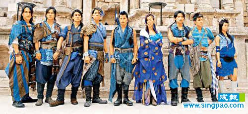 中新網4月22日電 據香港成報報道,九位百事巨星云集安曼古城,各自穿上古裝一字排開,氣勢十足。站在中央的依然是百事老大哥郭富城,天后鄭秀文站在他身旁,F4的少俠打扮各有特色,cool味十足,而周杰倫與蔡依林被陳冠希分隔開。九人的造型都是以藍色為主,周杰倫還扎上長辨,令人甚為新鮮。