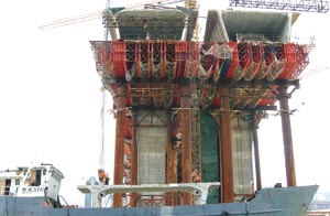 航道對上的橋面已接近合龍,每日均有工程船將每件重逾百噸的巨型預制件吊到橋面裝嵌。