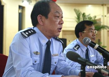 五月十二日,北京公安交通管理局新聞發言人張景春(左)向媒體通報:演員牛振華在二○○四年五月十一日二十三時二十分,因醉酒駕車發生交通事故當場死亡,其所駕駛“奔馳”牌小客車嚴重損壞。中新社記者 任海霞 攝