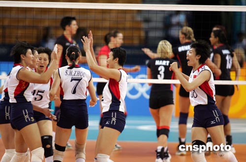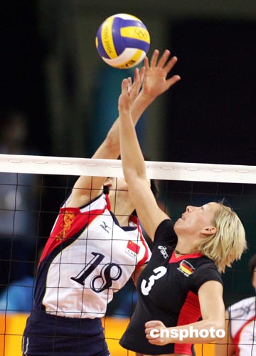 中國女排當?shù)貢r間八月二十日上午在雅典奧運會排球比賽中以三比零戰(zhàn)勝德國隊。中新社記者:毛建軍