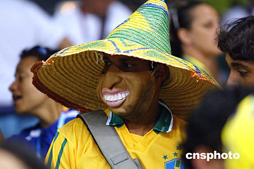 圖為在當地時間8月20日舉行的希臘隊與巴西隊的排球比賽中,一個球迷帶著古怪的面具為自己球隊加油。