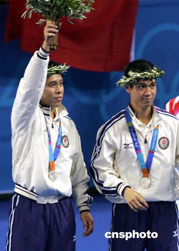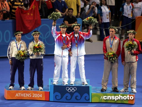 雅典當(dāng)?shù)貢r間8月21日下午,中國乒乓球選手馬琳、陳玘在男雙決賽中以4比2戰(zhàn)勝香港選手李靜、高禮澤,獲得本屆奧運(yùn)會男子雙打冠軍。中新社記者:任晨鳴
